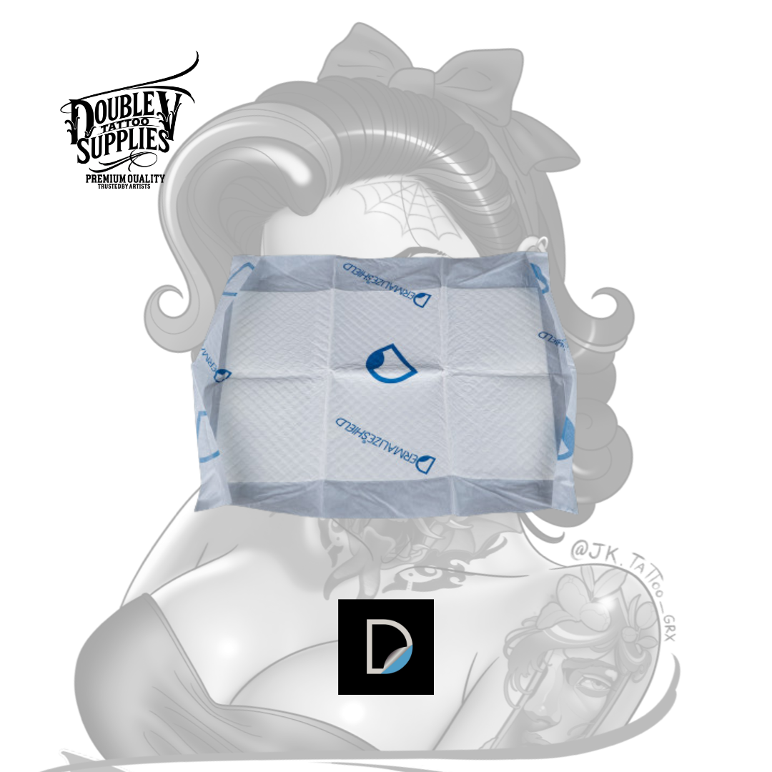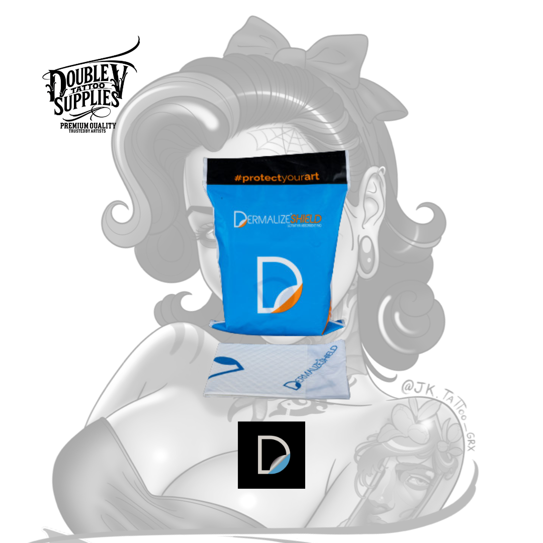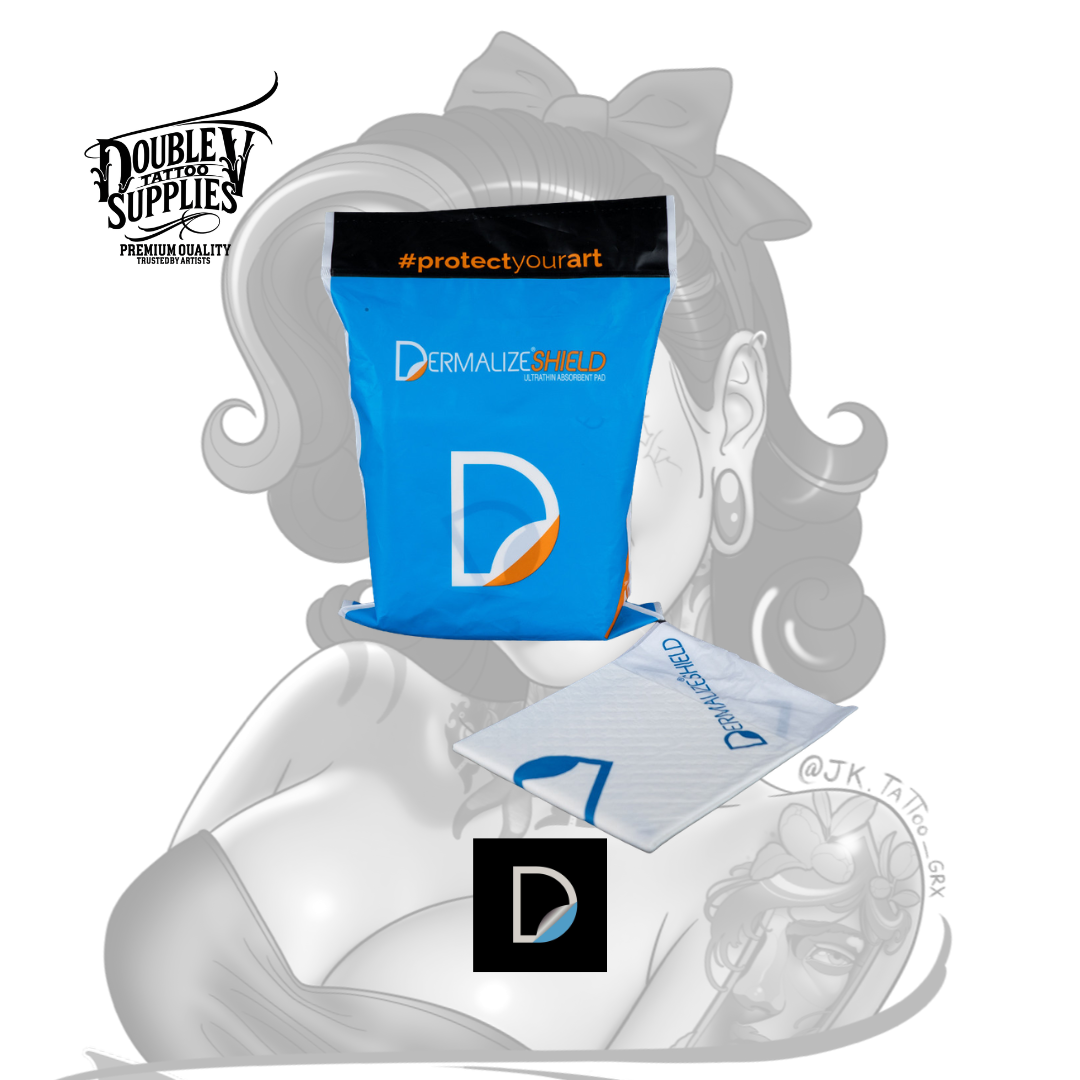 Día 1 (0 – 24/48h): Al terminar de tatuar, limpia la zona, coloca un Dermalize Shield y fíjalo con esparadrapo/cinta hipoalergénica. Si el tatuaje supura mucho, el cliente puede cambiarlo por uno nuevo a las pocas horas.