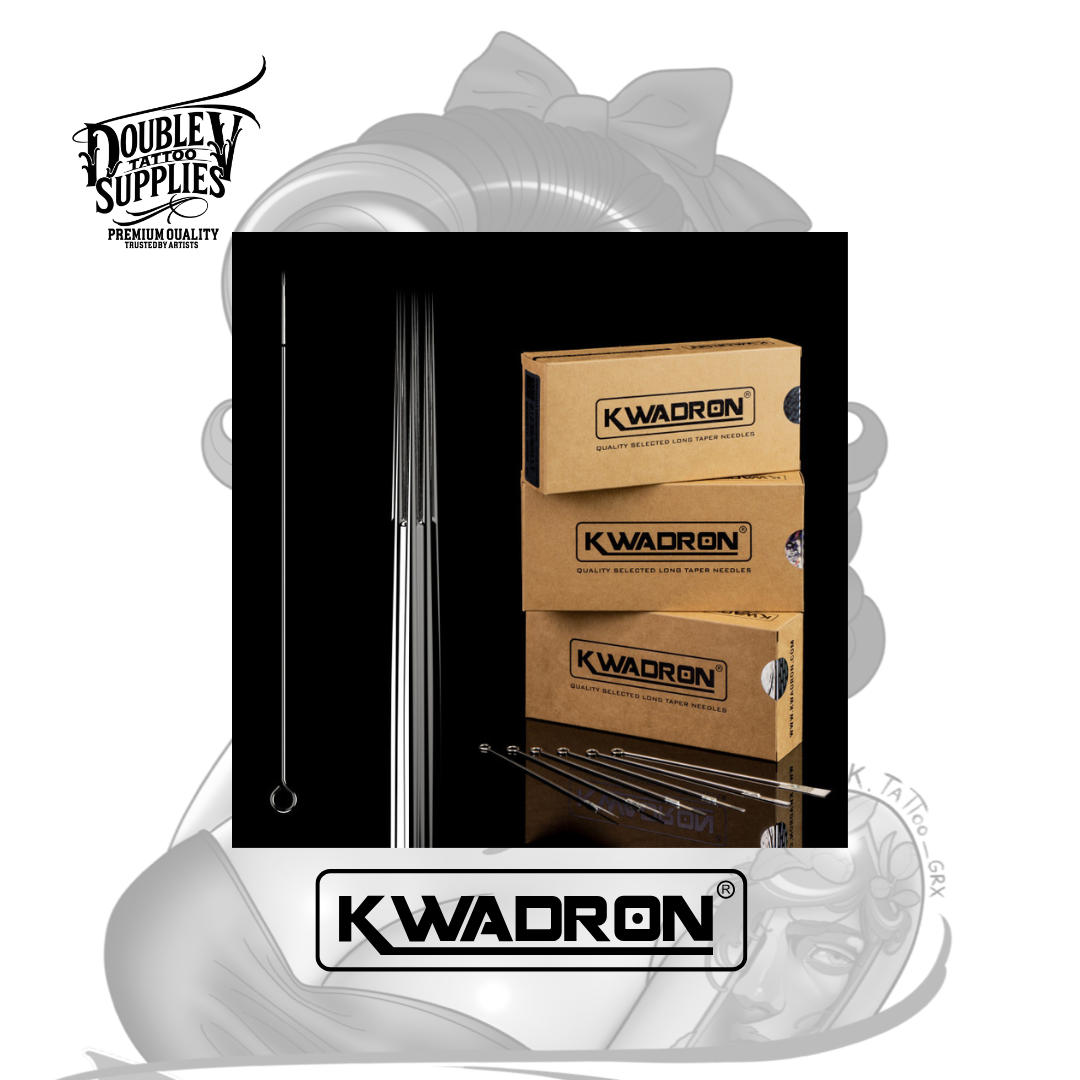 Agujas KWADRON Soft Edge Magnum para degradados suaves, control absoluto y curaciones limpias. Precisión profesional disponible en DOUBLE V TATTOO.