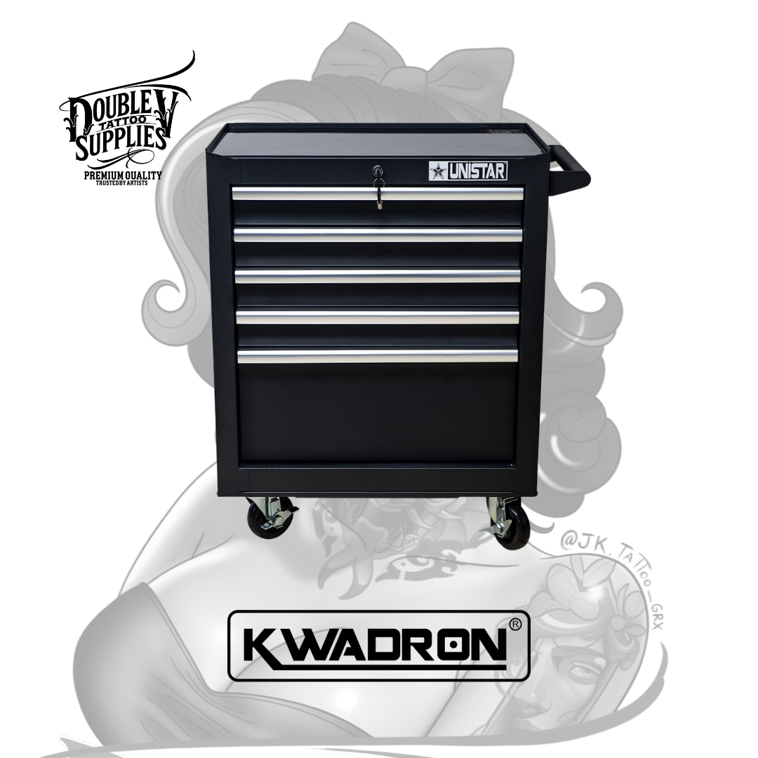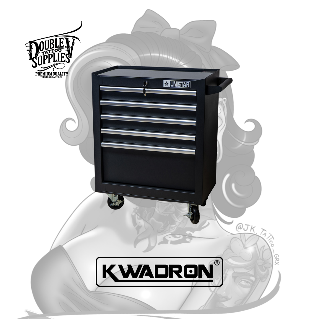 Mobile Working Table de Kwadron es la estación de trabajo móvil profesional de grado hospitalario con estructura soldada de acero reforzado, encimera de acero inoxidable pulido, y 5 cajones con guías telescópicas de cierre suave diseñada específicamente para centralizar todo el equipamiento crítico de tatuaje en una unidad móvil ultra-estable que elimina movimientos entre zonas del estudio mientras proporciona almacenamiento seguro con cerradura, superficie de trabajo higiénica de limpieza instantánea, y movilidad absoluta mediante 4 ruedas industriales con bloqueo que transforman la unidad de carrito móvil a estación fija en 2 segundos. No es un carrito doméstico adaptado: es mobiliario profesional certificado con peso de 38 kg que garantiza estabilidad anti-vuelco, dimensiones optimizadas 62x80x37 cm que maximizan almacenamiento sin ocupar espacio excesivo, y construcción con recubrimiento en polvo negro resistente a desinfectantes hospitalarios.