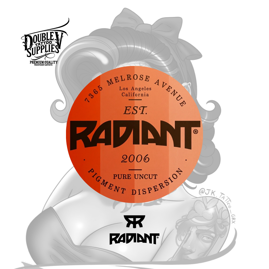 | 🟠 Bright Orange | Naranja puro, vivo y luminoso — el naranja base del catálogo Radiant. Alta concentración de pigmento, máxima saturación. Referencia imprescindible del estudio. «Brillante como el sol.» [web:934] | 1 oz (30 ml) Botella individual | New school, neotradicional, japonés. Color base para mezclas hacia rojo y amarillo. Rellenos vivos y saturados en grandes áreas. | 🔴 NO APTO para tatuar piel humana Confirmado por distribuidores ES: Pureworks, Ink Canarias, Vega Tattoo. [web:932][web:934][web:938] Uso exclusivo: piel sintética / formación. |